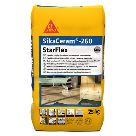 Mortier-colle lié au ciment, à prise hydraulique, à très grande aptitude à la déformation, optimisé en termes de consommation et de mise en œuvre, avec charges allégées, pour une application en couche mince, moyenne et épaisse jusqu'à une épaisseur de couche de 25 mm. Conforme aux exigences de la classe C2 TE S1 selon EN 12004, C2 E S1 avec une consistance fluide.