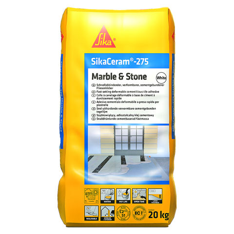 Malta adesiva bianca a presa rapida, elastificata, dalla consistenza regolabile, contenente trass, per la posa di piastrelle e pietra naturale in strato sottile e medio e in letto fluido in spessori fino a 30 mm. Soddisfa i requisiti della classe C2 FTE S1 secondo la EN 12004, C2 FE S1 con consistenza fluida.